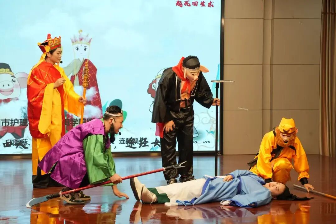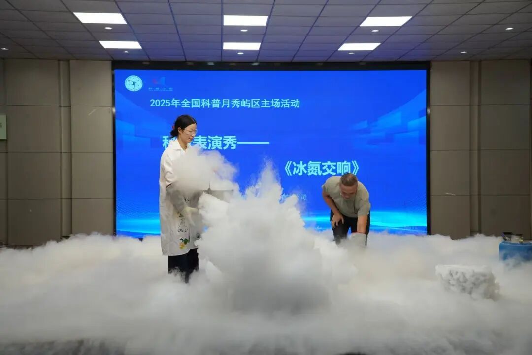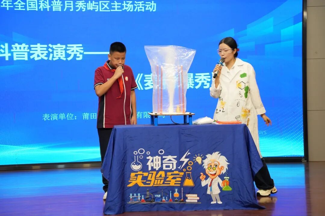 节目伊始,科普表演秀《袋力冲天》,表演者通过简易发射装置,利用“作用力与反作用力”原理,让充气后的塑料袋快速“冲天”飞行;科普表演秀《麦粉爆秀》,表演者结合实验讲解“燃烧条件”“浓度阈值”等知识,带来震撼的视觉体验;科普表演秀《冰氮交响》-196℃液氮奏响科学交响,云雾升腾间演绎相变奇迹,是视觉盛宴亦是知识启迪;健康科普《西游记—起死回生术》+脊柱活力健康操,医护人员现场演示心肺复苏等急救技能,用通俗的语言讲解“紧急时刻如何自救互救”,随后,师生共同跳起脊柱活力健康操,在轻快的动作中学习护脊知识,将“健康生活”的理念融入生动实践。