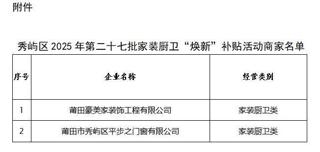 根据国家、省、市关于做好2025年消费品以旧换新相关工作部署以及《福建省商务厅等6部门关于印发福建省2025年支持家装厨卫“焕新”补贴实施细则的通知》(闽商务规〔2025〕4号)等文件要求,经商家报名提交材料及我单位审核通过,现公布秀屿区2025年第二十八批家装厨卫“焕新”补贴活动商家名单(见附件)。按照相关要求,活动商家须具备与服务机构进行系统对接的能力,故实际活动商家及门店以活动平台公开的活动门店为准。 附件:秀屿区2025年第二十八批家装厨卫“焕新”补贴活动商家名单 秀屿区商务局 2025年9月30日