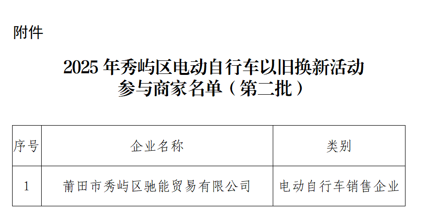 根据国家、省、市关于做好2025年消费品以旧换新相关工作部署以及根据《福建省商务厅等8部门关于印发<福建省2025年电动自行车以旧换新补贴实施细则>的通知》(闽商务规〔2025〕5号)等文件要求,经商家报名提交材料参加“补贴立减”模式及我单位审核通过,现公布2025年秀屿区第二批符合条件的电动自行车活动参与商家名单(见附件)。按照相关要求,活动商家须具备与服务机构进行系统对接的能力,故实际活动商家及门店以活动平台公开的活动门店为准。 附件:2025年秀屿区电动自行车以旧换新活动参与商家名单(第二批) 秀屿区商务局 2025年10月17日