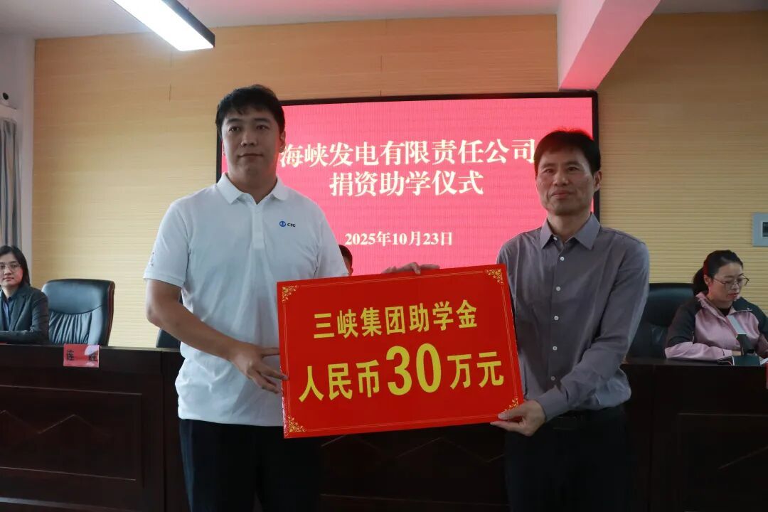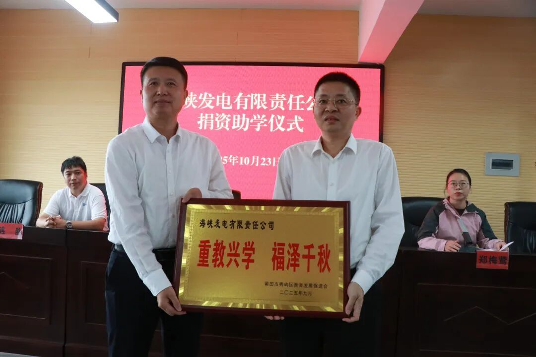 仪式上,海峡发电有限责任公司与区教育局共同签署捐赠协议,现场由海峡发电有限责任公司捐赠30万元,并向60名学生发放助学金。捐赠结束后,吴建忠为海峡发电有限责任公司授匾。