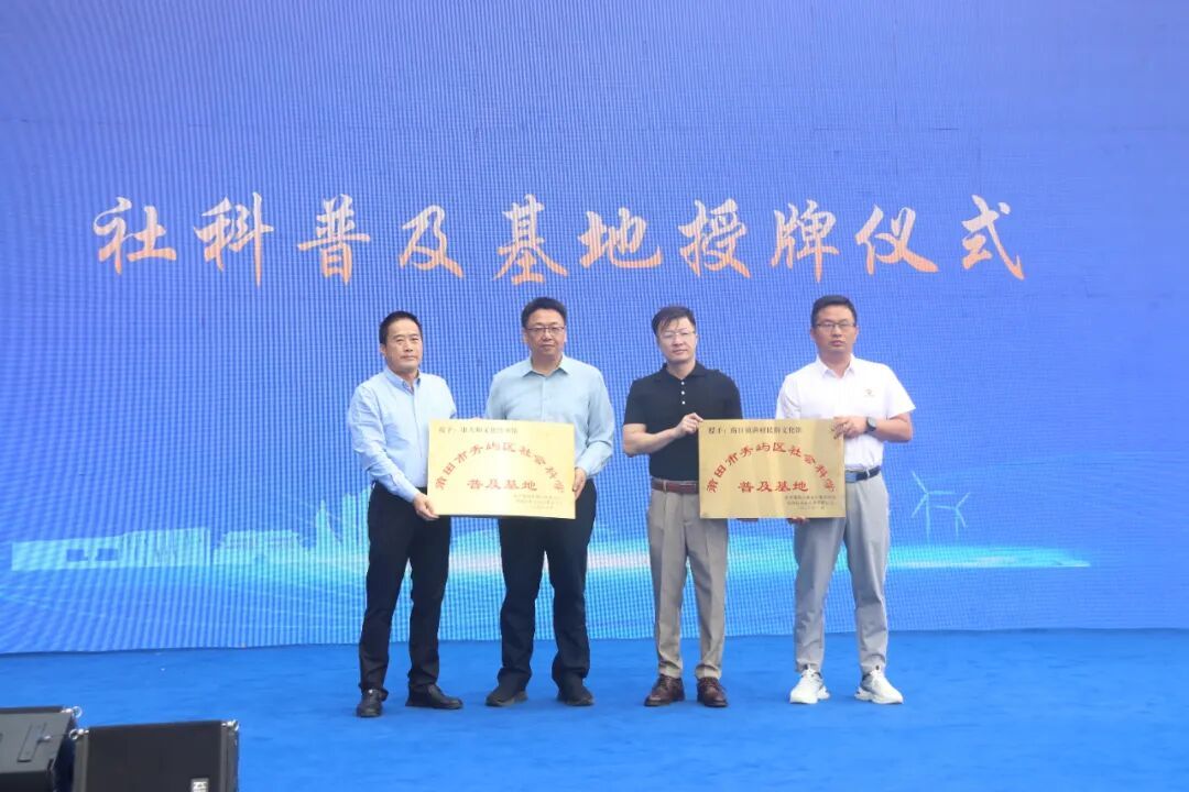 与会领导嘉宾共同上台推杆,启动2025年莆田市社会科学普及宣传周活动。现场还举行了秀屿区社科普及基地授牌仪式,向南日镇“渔村民俗文化馆”、月塘镇“康大和文化传承馆”两家单位授牌,并向基地赠送了一批优质社科理论书籍。