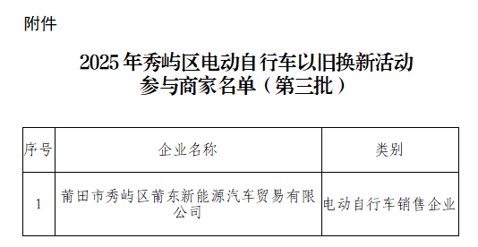 根据国家、省、市关于做好2025年消费品以旧换新相关工作部署以及根据《福建省商务厅等8部门关于印发<福建省2025年电动自行车以旧换新补贴实施细则>的通知》(闽商务规〔2025〕5号)等文件要求,经商家报名提交材料参加“补贴立减”模式及我单位审核通过,现公布2025年秀屿区第三批符合条件的电动自行车活动参与商家名单(见附件)。按照相关要求,活动商家须具备与服务机构进行系统对接的能力,故实际活动商家及门店以活动平台公开的活动门店为准。 附件:2025年秀屿区电动自行车以旧换新活动参与商家名单(第三批) 秀屿区商务局 2025年10月31日