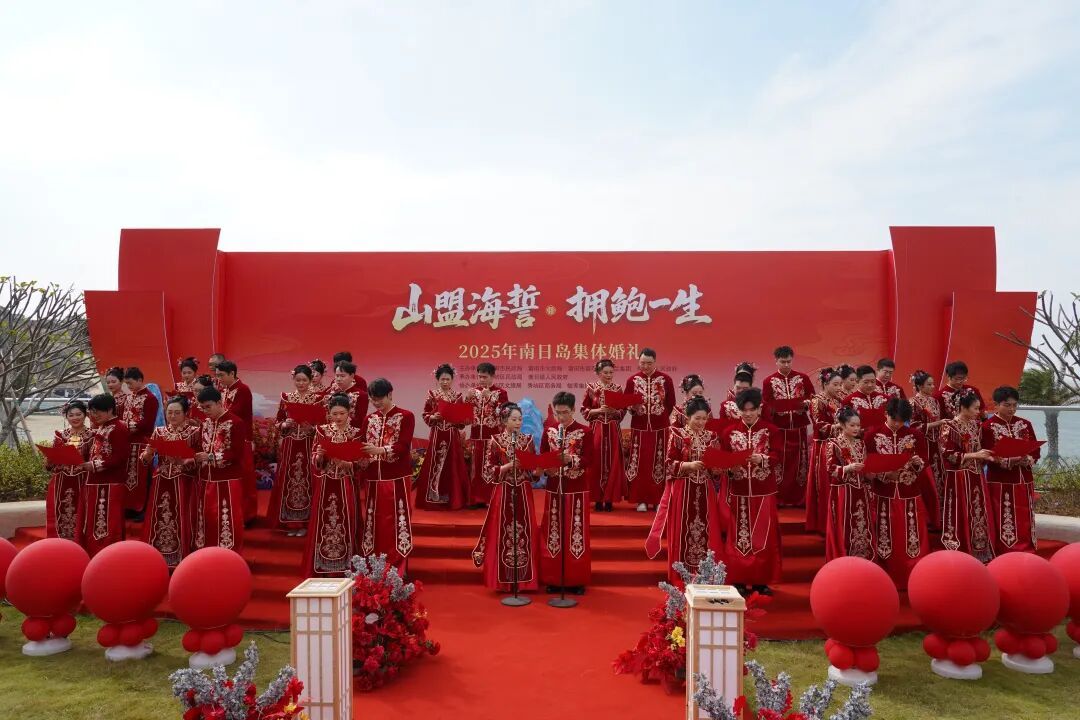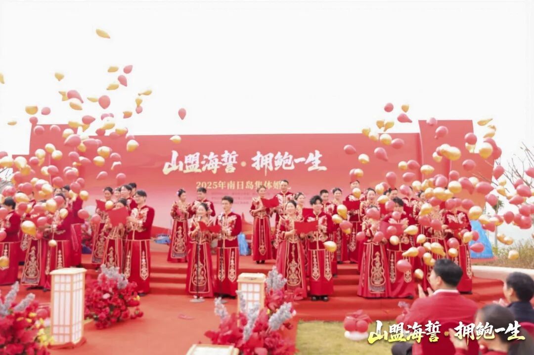 婚礼保留了传统“三拜之礼”的传统精髓,并创新融入了集体宣誓环节,新人们共同承诺践行文明婚俗、推动移风易俗。莆田民俗推介官秋生的“撒帐”祝福,为现场增添了浓厚的民俗喜庆氛围。最后,新人们向宾客分发喜糖,在欢快的《结婚啦》歌声中,完成集体合影,整个过程简约而不失隆重,传统与现代交织,充分展现了新时代婚嫁新风。 当天,新人们还在南日岛的月亮湾、福鲍沙滩等自然美景中拍摄写真,留下浪漫瞬间。晚间,活动移步莆田状元楼,新人们参与了“状元楼上生状元”主题活动,观看新科状元演唱会、品尝特色状元宴,在传统文化的熏陶中,感悟“成家立业”的深刻内涵。 幸福产业:文旅融合开新局 甜蜜经济促发展 在活动的后续,新人们及亲属还将前往参观五侯山、湄洲岛妈祖祖庙及仙游九鲤湖等著名景区进行参观,深度体验莆田独特的祈梦文化与妈祖文化,为此次浪漫之旅画上了圆满的句号。