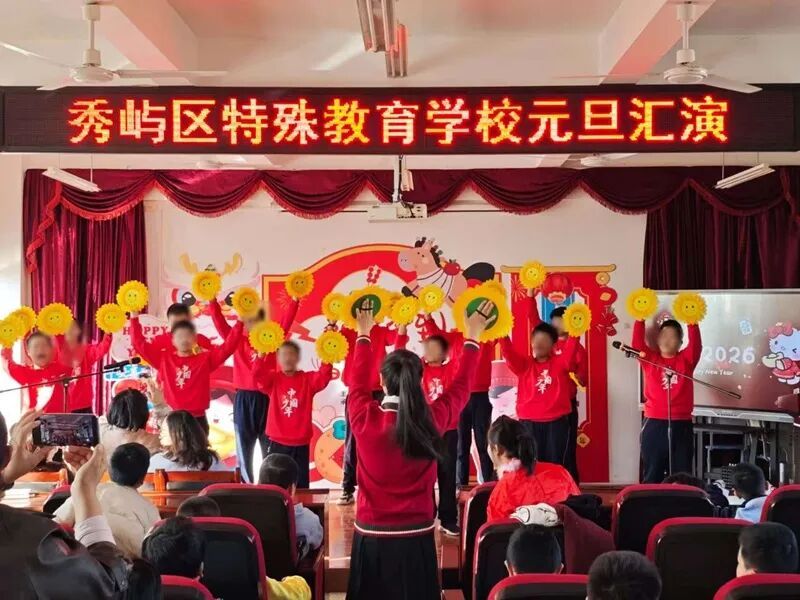 秀屿区特殊教育学校“庆元旦”文艺汇演温情上演,全校师生在暖意融融的氛围中迎接新年。汇演在合唱《红红的太阳》中拉开序幕,孩子们用真挚而纯朴的歌声,唱出对生活的热爱、对未来的向往,声声入心。随后,《欢喜中国年》《中国威武》《好运来》等歌舞节目接连登场,台上童真绽放,台下温情流动,现场洋溢着温暖、快乐与感动。活动还特别邀请到莆仙赞句达人助阵,伴着朗朗上口的方言赞句,一声声吉祥如意的祝福响彻现场,将节日气氛推向高潮,为新的一年铺展出一幅充满阳光与希望的温暖画卷。