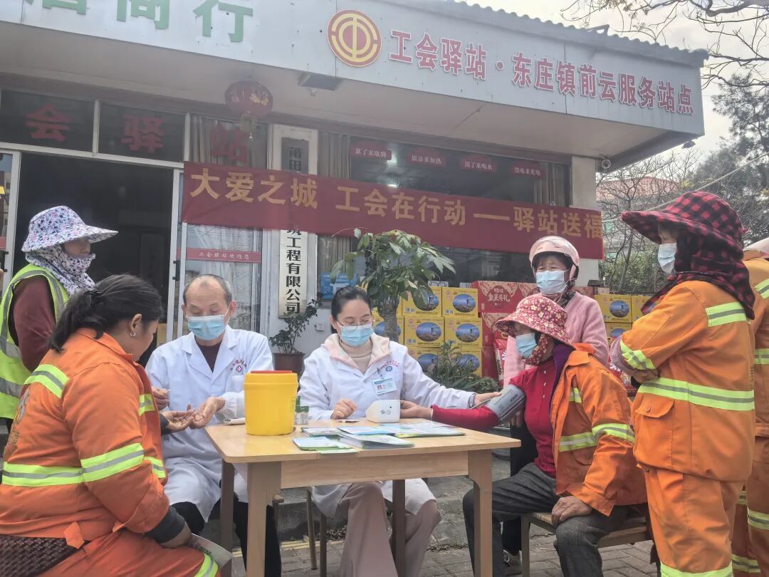 在东庄镇前云工会驿站,区总工会联合镇总工会开展“大爱之城 工会在行动——驿站送福”活动,为环卫工人开展健康知识讲座、义诊服务,并现场赠送春联,深受大家欢迎。