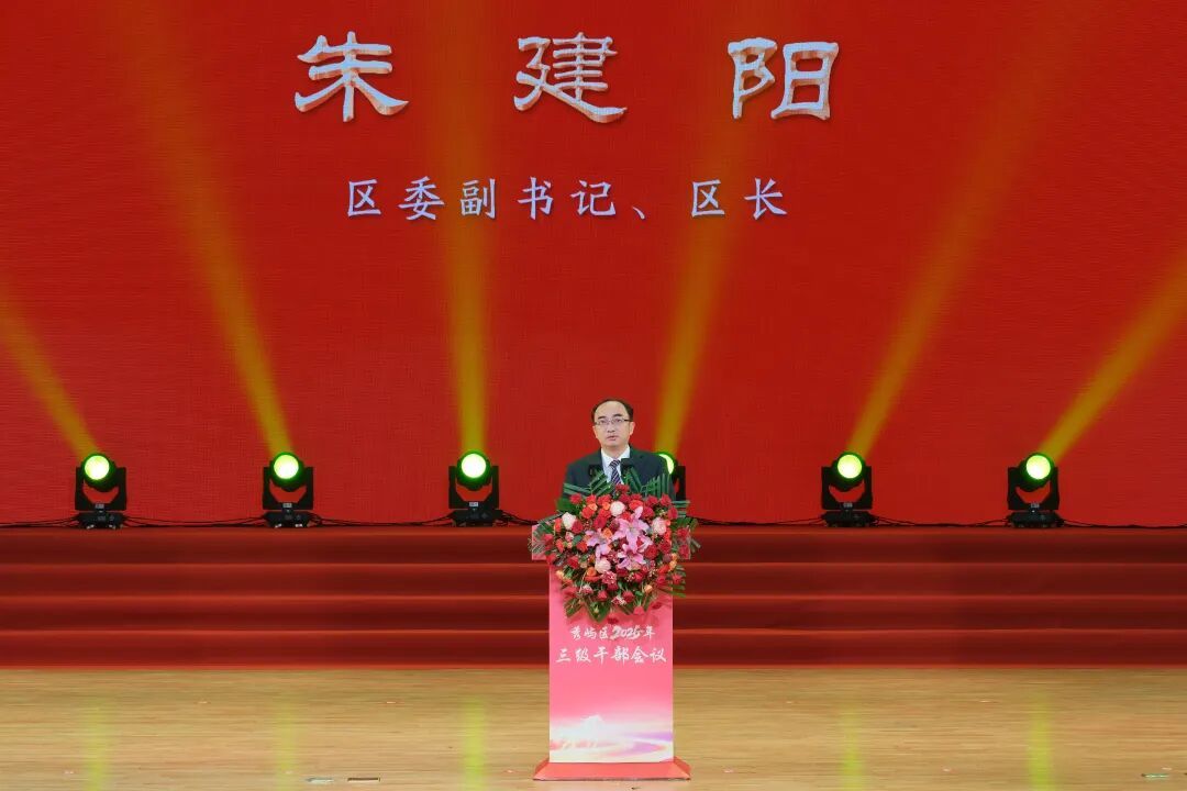 “龙马踏春,奋楫出征!”朱建阳代表区委、区政府致辞,向春节期间坚守奋战在各条战线的广大干部职工致以敬意、表示感谢。他指出,过去一年,全区上下踔厉奋发、勇毅前行,不负期望、不负使命,产业能级跃升、城市面貌更新、民生福祉升温,干出了“争第一”的新气象、拼出了“创唯一”的新标杆,GDP 领跑全市,10 条产业链聚链成群,32 项为民办实事落地见效,发展势头澎湃有力、实绩清单亮眼提气。他引用市委付朝阳书记寄语,以“打头阵、当主力、作贡献”“内心有光、内心有爱、内心有纪”“一家人,一条心,一起干”与大家共勉,希望全区上下闻令而动、到岗入列,把会场当现场、请主角到主位,深耕“产港城人”四篇文章,以大爱聚民心、以文化润民心、以温情暖人心,以纪律正风向、以规矩强担当、以清廉树形象,同频共振、实干争先,万众一心、众志成城,聚力打造工业、海洋、能源、人口“四个大区”,全力推动转型跨越、提质增效,让秀屿发展既有高度、又有温度、更有厚度,全力以赴冲刺“开门红”、夺取“全年红”。