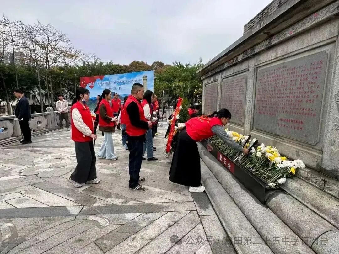 3月26日,莆田第二十五中学组织党员教师、入团积极分子代表前往闽中革命烈士陵园,开展“我们的节日·清明”主题活动。在庄严肃穆的陵园内,师生集体默哀、敬献花篮、鞠躬致敬,深切缅怀革命先烈。党员教师面向党旗重温入党誓词,全体人员依次敬献鲜花、绕行瞻仰纪念碑,表达对先烈的崇高敬意。随后,师生走进闽中革命纪念馆,聆听讲解、观看史料,重温闽中地区光辉革命历史,接受一次深刻的红色精神洗礼。此次活动是一堂深刻的理想信念教育实践课,参与师生深受思想洗礼与精神感召。大家纷纷表示,将把爱国之情、报国之志融入日常学习与工作中,牢记使命、奋发进取,努力在新时代新征程上书写青春答卷。