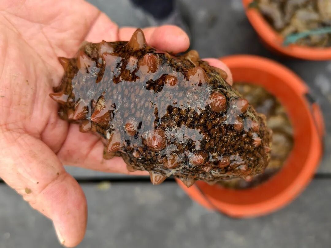 据了解,眼下收获的海参是去年11月底从辽宁大连引进的优质海参苗,依托秀屿温暖适宜的海域环境,海参生长周期大幅缩短,经过四个多月的科学养殖,其个头实现数倍增长,品质大幅提升。汇鑫城水产养殖有限公司负责人林冬青随手捞起一只海参向记者介绍:“采购回来时一斤大约在8头到15头之间,现在基本上已达到一斤2头到3头的规格,品质可媲美辽参。”
