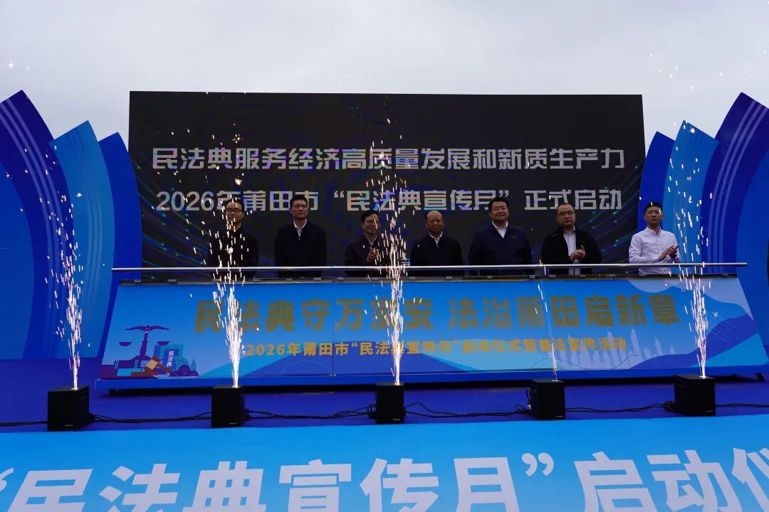 4月30日,2026年莆田市“民法典宣传月”启动仪式在秀屿区举行。市司法局党组书记、局长郭雄飞,市司法局政治部主任林平转,市烟草专卖局纪检组长庄进勇,区委常委、宣传部部长、区守法普法协调小组组长林淼鑫出席活动,区直相关单位负责人、律师代表、“蒲公英”普法志愿者及群众代表参加活动。