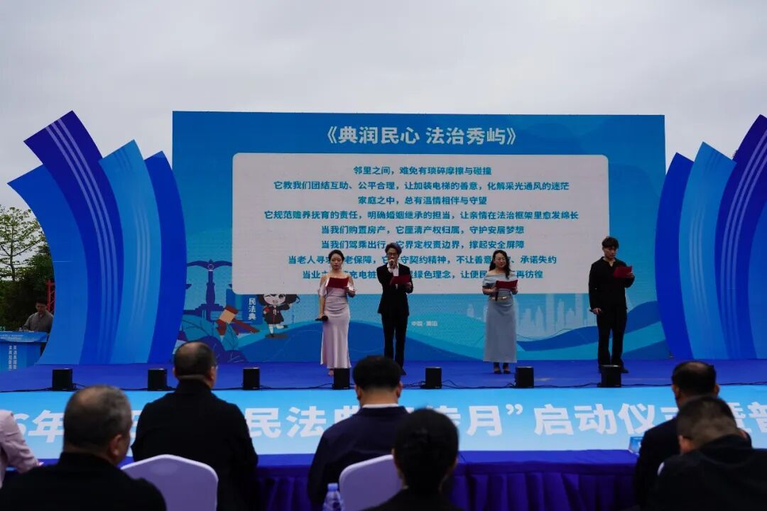 本次活动以“民法典服务经济高质量发展和新质生产力”为主题,现场环节紧凑有序、普法形式鲜活生动。仪式上,与会领导嘉宾共同启动活动,随后《法治秀屿》歌伴舞、民法典赞句、《民法歌谣》演唱、主题书法展示、诗歌朗诵、移风易俗情景剧、法治歌曲串烧等特色节目依次上演,将法治内容与文艺表演深度结合,让法治宣传更接地气、深入人心。